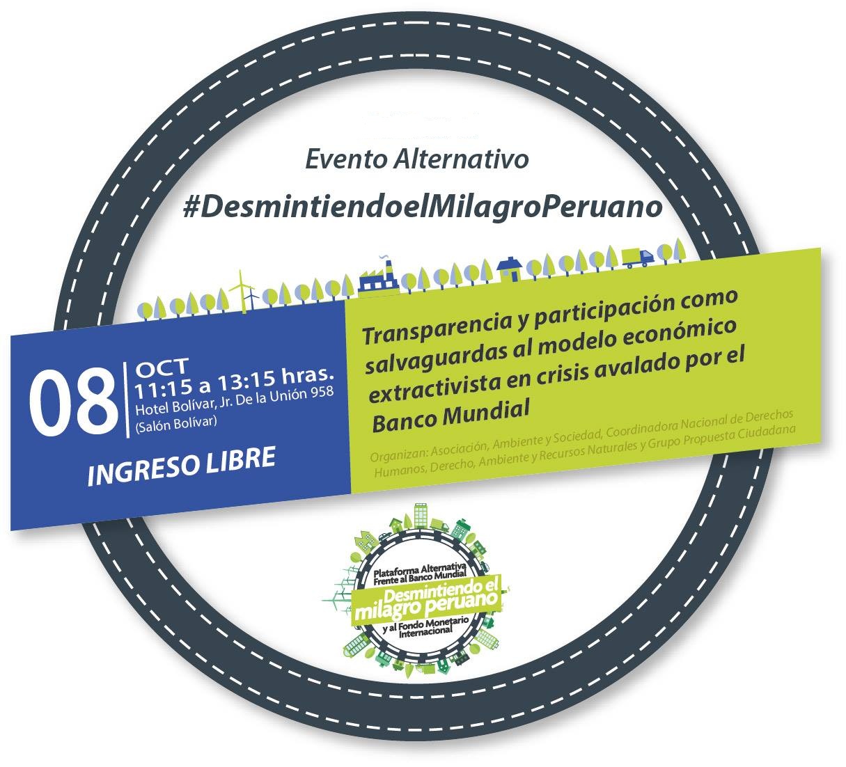 En el marco de las reuniones anuales del BM y el FMI que iniciaron hoy en Perú, nace una plataforma alternativa de organizaciones sociales, de la cual Ambiente y Sociedad es miembro. Esta plataforma ofrecerá desde 7 al 9 de octubre más de 40 discusiones y paneles en el evento #DesmintiendoElMilagroPeruano, en el Hotel Bolívar de Lima-Perú, donde se analizarán las políticas de financiamiento de proyectos del Banco Mundial y el Fondo Monetario Internacional. Consultar agenda completa aquí