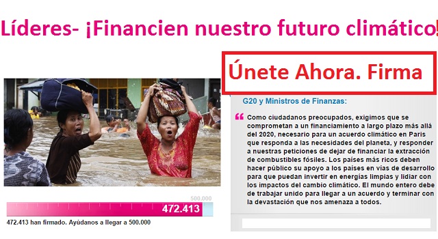 “Como ciudadanos preocupados, exigimos que se comprometan a un financiamiento a largo plazo más allá del 2020, necesario para un acuerdo climático en Paris que responda a las necesidades del planeta, y responder a nuestras peticiones de dejar de financiar la extracción de combustibles fósiles. Los países más ricos deben hacer público su apoyo a los países en vías de desarrollo para que puedan invertir en energías limpias y lidiar con los impactos del cambio climático. El mundo entero debe de trabajar unido para llegar a un acuerdo y terminar con la devastación que nos amenaza a todos.”