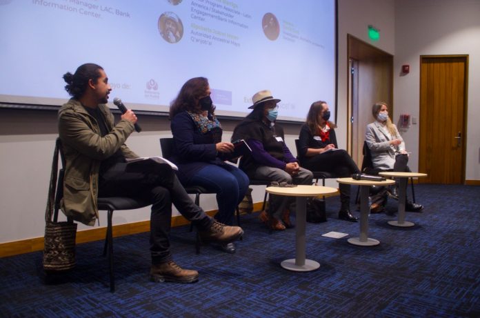 David Cruz, investigador de Ambiente y Sociedad, participó como moderador, y como expositores Mara Bocaletti, directora ejecutiva de la Plataforma Internacional contra la Impunidad; Carolina Juaneda, gerenta del Programa para América Latina del Bank Information Center; Rigoberto Juárez, coordinador del Gobierno Ancestral Plurinacional (GAP) y María Camila Barriga, representante del Compliance Advisor Ombudsman.