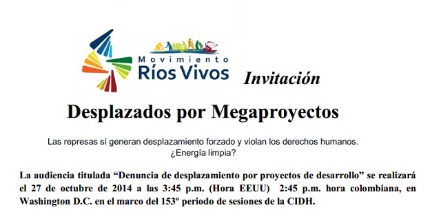La Comisión Interamericana de Derechos Humanos -CIDH- aceptó nuevamente la solicitud del Movimiento Colombiano en Defensa de los Territorios y afectados por represas Ríos Vivos para hablar sobre el desplazamiento por represas en el país, donde cobra especial importancia el desplazamiento generado por las represas en Colombia.