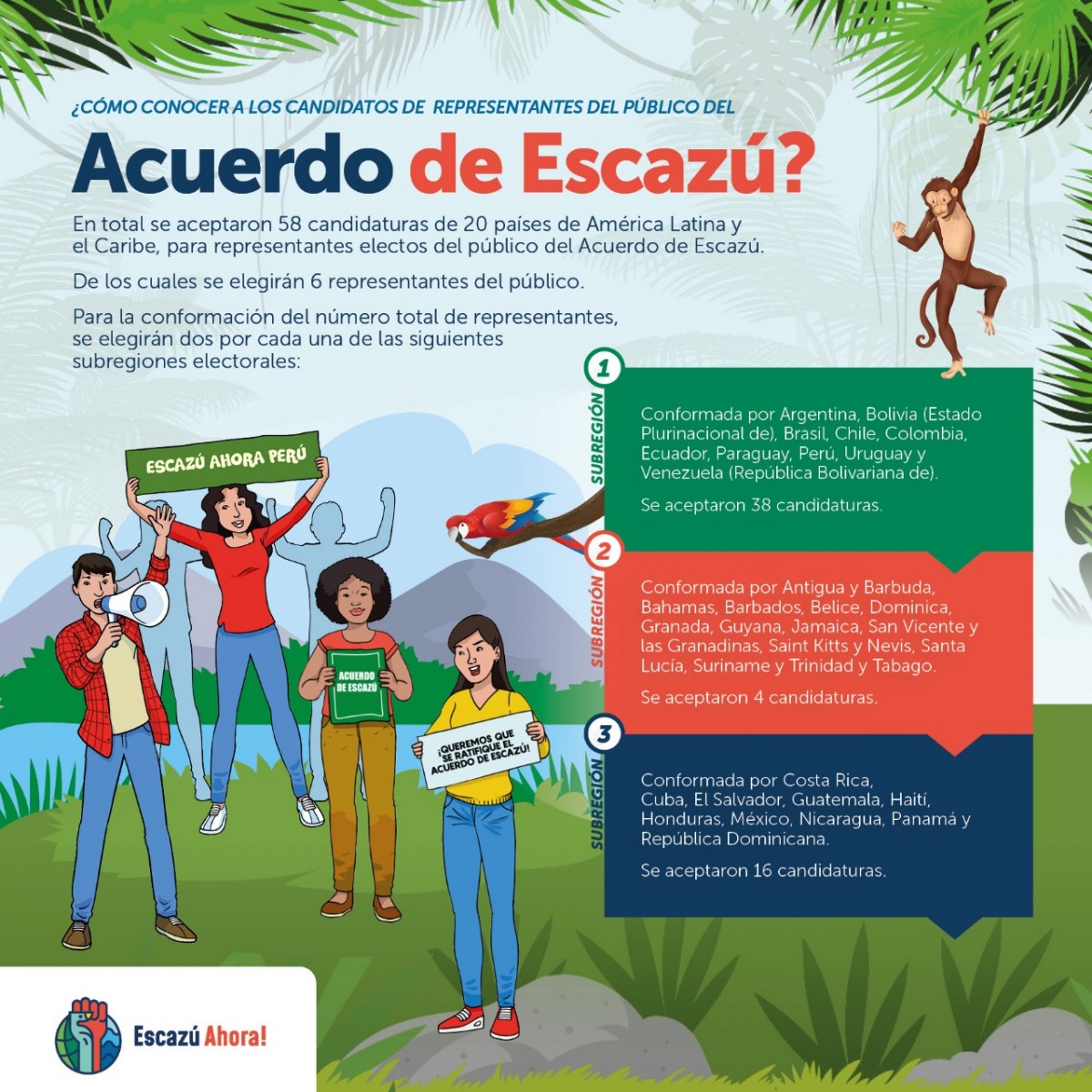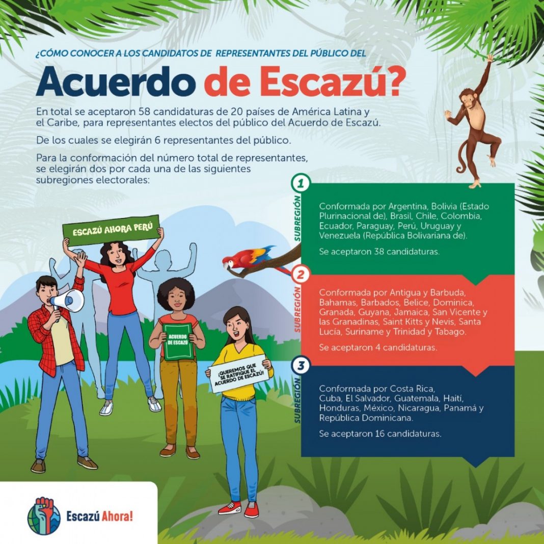 El 31 de agosto del 2022 a las 23:59 horas de Santiago de Chile se cerró el plazo para la presentación de candidaturas para representantes electos del público del Acuerdo de Escazú. En total, se recibieron 72 candidaturas de 20 países de América Latina y el Caribe. De las 72 candidaturas recibidas, 58 fueron aceptadas y 14 no fueron admitidas por incumplir los requisitos señalados en el artículo 7 del Reglamento de las elecciones o haber remitido la candidatura fuera de plazo (con posterioridad a las 23:59 horas de Santiago, Chile del 31 de agosto de 2022).