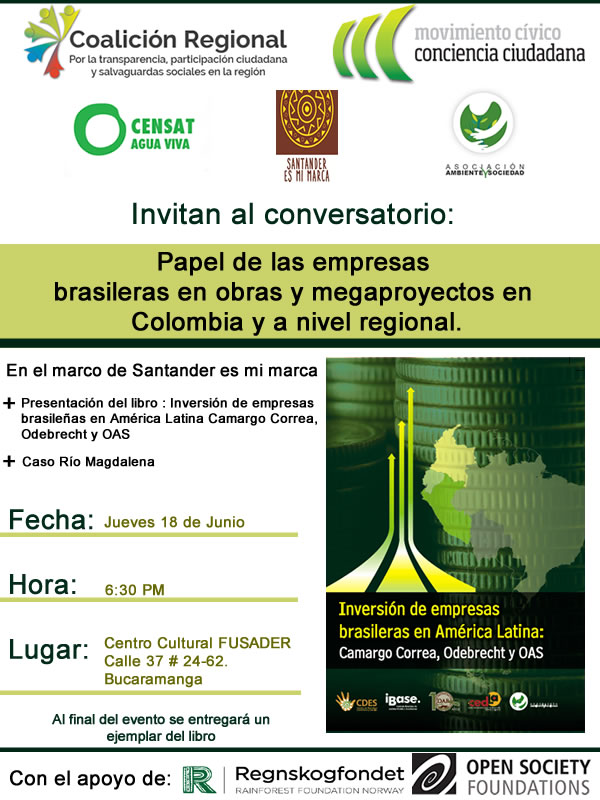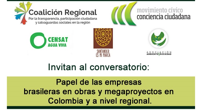 Organiza: Coalición Regional por la Transparencia y Participación, Asociacióm Ambiente y Sociedad, Movimiento Civico Conciencia Ciudadana, Censat Agua Viva y Santander es mi marca.