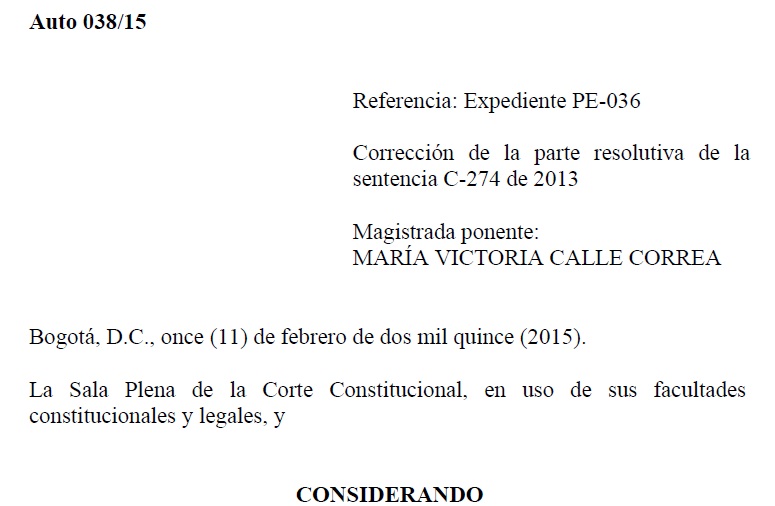 De esta manera en Mayo de 2014 Ambiente y Sociedad interpuso una solicitud de aclaración de la sentencia solicitando que se corrigiera esta omisión, lo cual hizo la Corte por medio del Auto 038 de 2015, en el que se reconoce la omisión, se corrige la sentencia, se ordena publicar el auto y notificar a todas las entidades estatales sobre este cambio.