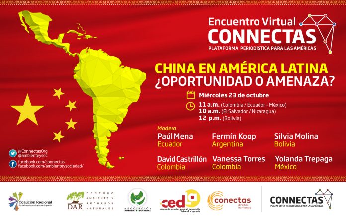En este Encuentro Virtual organizado por la Asociación Ambiente y Sociedad en alianza con CONNECTAS, hablaremos sobre la presencia del gigante asiático en América Latina y el Caribe, y las oportunidades o amenazas que representa. Así mismo, los impactos de su inversión en sectores clave como el energético, la infraestructura y los agronegocios, entre otros.