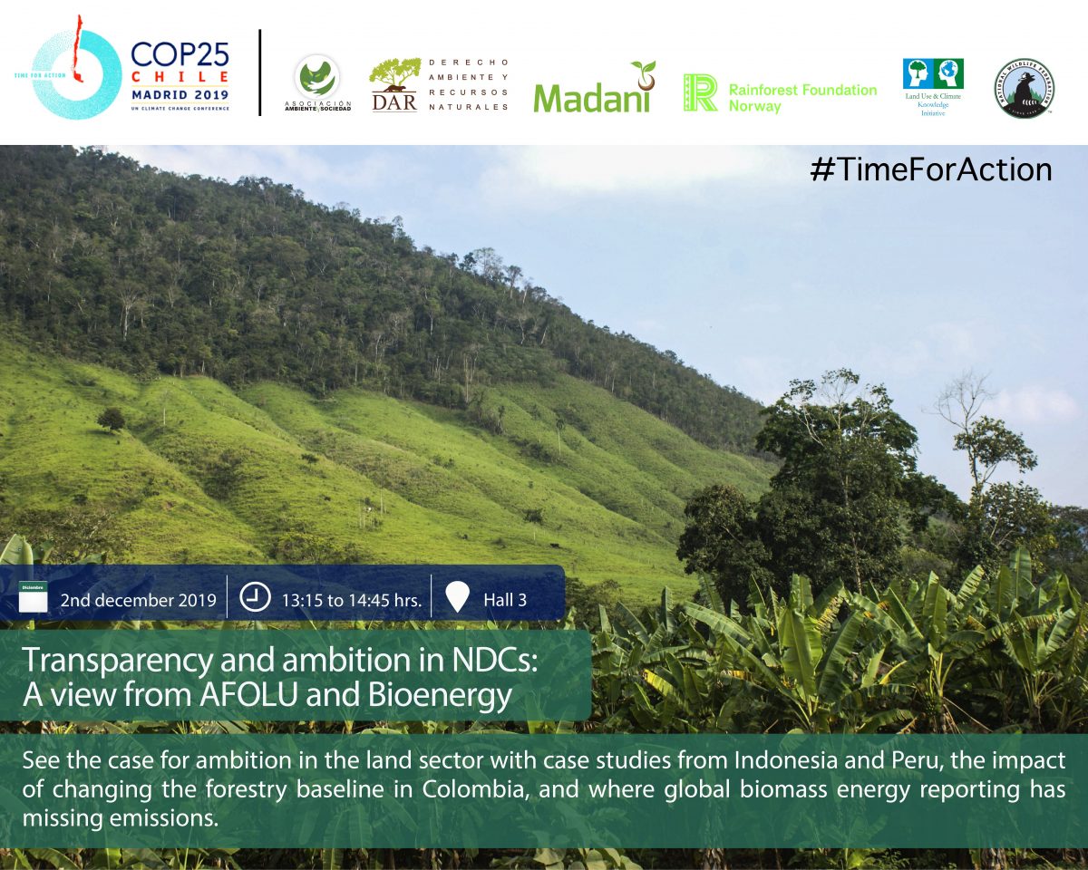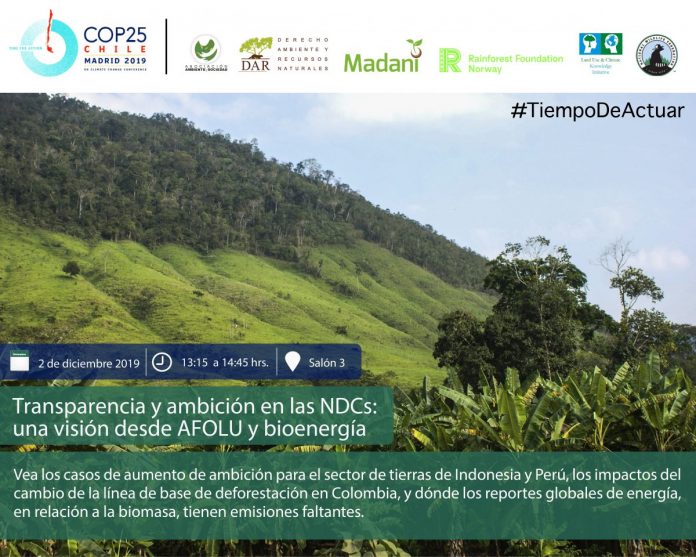 El 2 de diciembre en el evento “Transparencia y ambición en las NDCs: Una Visión desde AFOLU y bioenergía” se hablará sobre los casos de umento de ambición para el sector de tierras de Indonesia y Perú, los impactos del cambio de la línea de base de deforestación en Colombia, y dónde los reportes globales de energía, en relación a la biomasa, tienen emisiones faltantes, desde la 1:15 pm a 2:45pm en el Salón 3