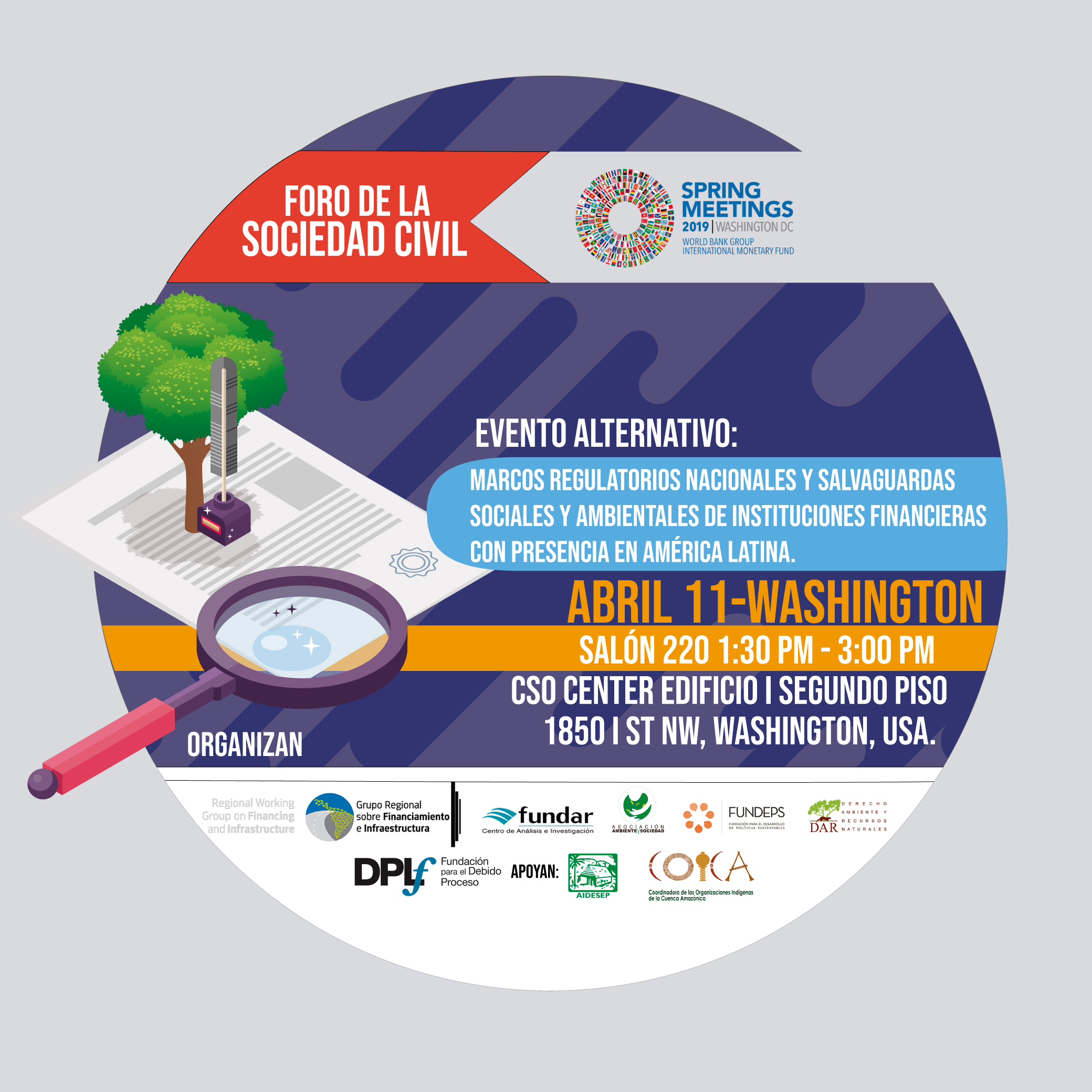 En el marco del foro de la sociedad civil de las reuniones de primavera del Banco Mundial y presentamos el evento alternativo “Marcos regulatorios nacionales y salvaguardas sociales y ambientales de instituciones financieras con presencia en América Latina” donde se evaluará la evolución de las regulaciones ambientales nacionales en América Latina y las salvaguardas ambientales de las principales IFIS en la región. Asimismo, proporcionar recomendaciones de políticas para lograr estándares de sostenibilidad en proyectos de infraestructura, a partir del trabajo del Grupo de Infraestructura y Energía de AIDESEP y la experiencia de COICA en el Examen Periódico Universal (EPU) realizado a China.