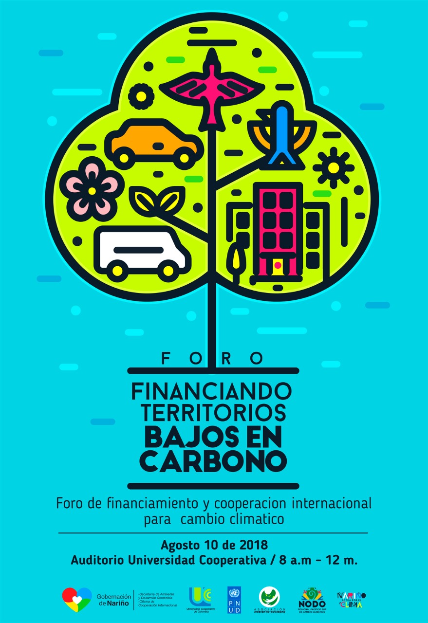 La Secretaría de Ambiente y Desarrollo Sostenible, la Oficina de Cooperación Internacional de la Gobernación de Nariño; con el apoyo del Programa de las Naciones Unidas para el Desarrollo- PNUD y la Universidad Cooperativa de Colombia, invitan a la ciudadanía de los departamentos de Nariño, Putumayo, Cauca, Valle del Cauca y de la Prefectura del Carchi en Ecuador al foro: “Financiando Territorios bajos en Carbono”.