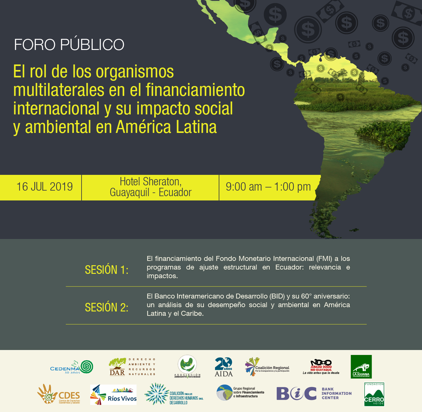 Organizan: Coordinadora Ecuatoriana de organizaciones para la Defensa de la Naturaleza y el Medio Ambiente (CEDENMA), Derecho Ambiente y Recursos Naturales (DAR), Asociación Ambiente y sociedad (AAS), Asociación Interamericana para la Defensa del Ambiente (AIDA), Coalición Regional por la Transparencia y la Participación, Jubileo 2000, Grupo Regional de Financiamiento para la Infraestructura (GREFI), Bank Information Center (BIC), Centro de Derechos Económicos y Sociales (CDES), Ríos vivos de Colombia, Coalición para los Derechos Humanos en el Desarrollo, Fundación la Iguana, Fundación Cerro Verde.