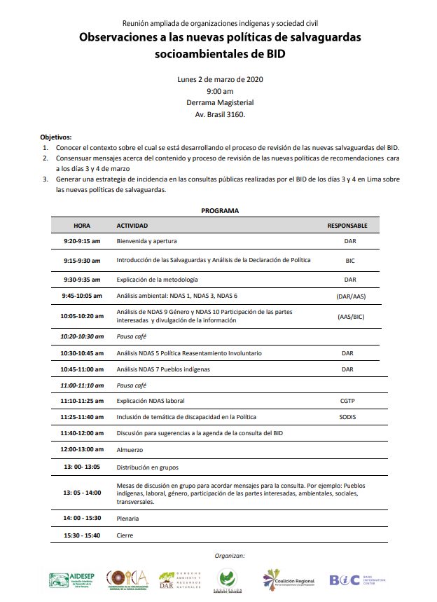 3. Generar una estrategia de incidencia en las consultas públicas realizadas por el BID de los días 3 y 4 en Lima sobre las nuevas políticas de salvaguardas.