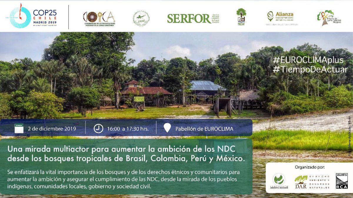En la COP25 se presentará el Side Event “Una mirada multiactor para aumentar la ambición de las NDC desde los bosques de Brasil, Colombia, Perú y México” en el Pabellón EUROCLIMA+ de 4 p.m. a 5:30 p.m. (Hora Madrid, España), entizando la vital importancia de los bosques y de los derechos de los pueblos indígenas y comunidades locales.