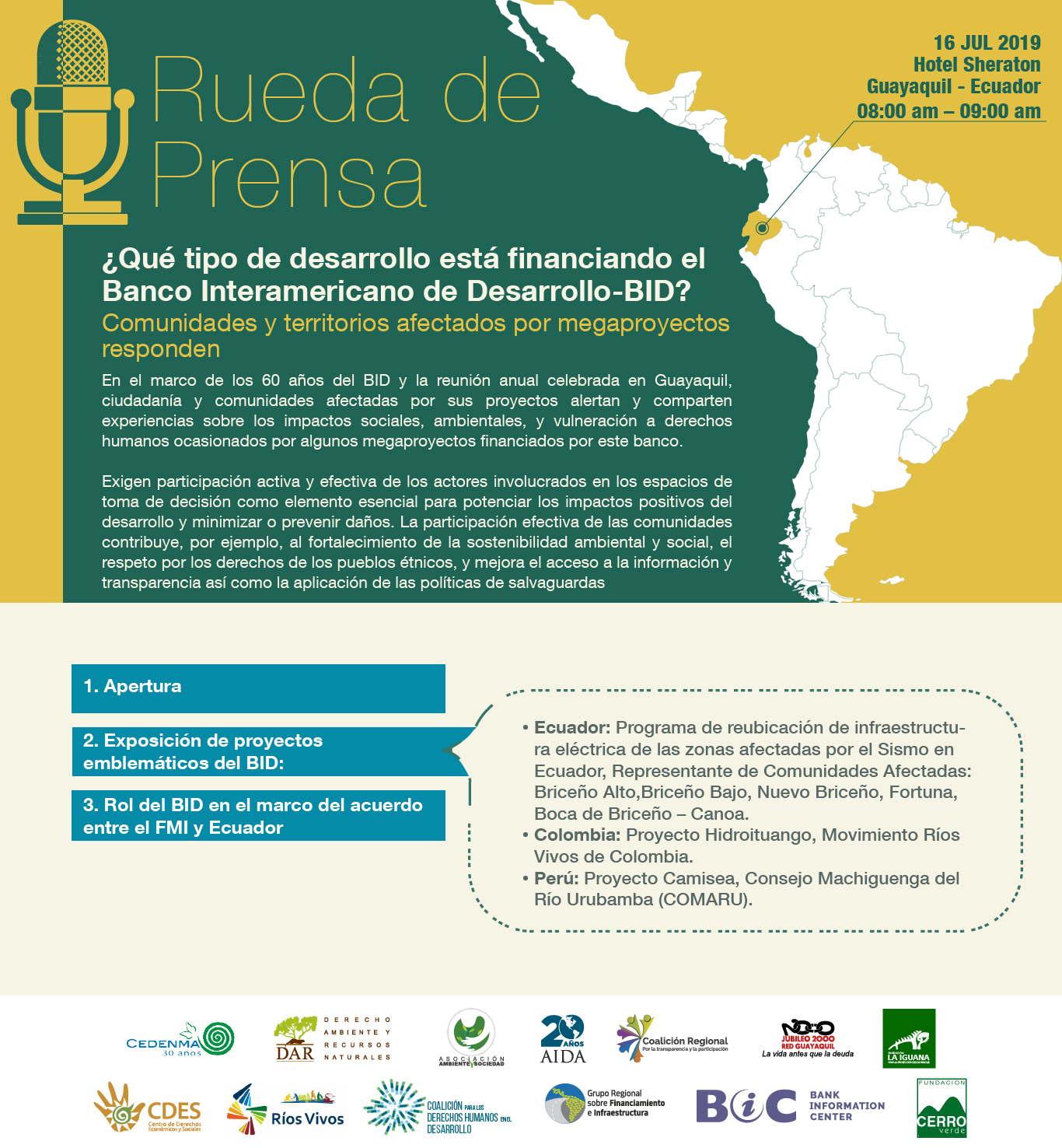 Organizan: Coordinadora Ecuatoriana de organizaciones para la Defensa de la Naturaleza y el Medio Ambiente (CEDENMA), Derecho Ambiente y Recursos Naturales (DAR), Asociación Ambiente y sociedad (AAS), Asociación Interamericana para la Defensa del Ambiente (AIDA), Coalición Regional por la Transparencia y la Participación, Jubileo 2000, Grupo Regional de Financiamiento para la Infraestructura (GREFI), Bank Information Center (BIC), Centro de Derechos Económicos y Sociales (CDES), Ríos vivos de Colombia, Coalición para los Derechos Humanos en el Desarrollo, Fundación la Iguana, Fundación Cerro Verde.