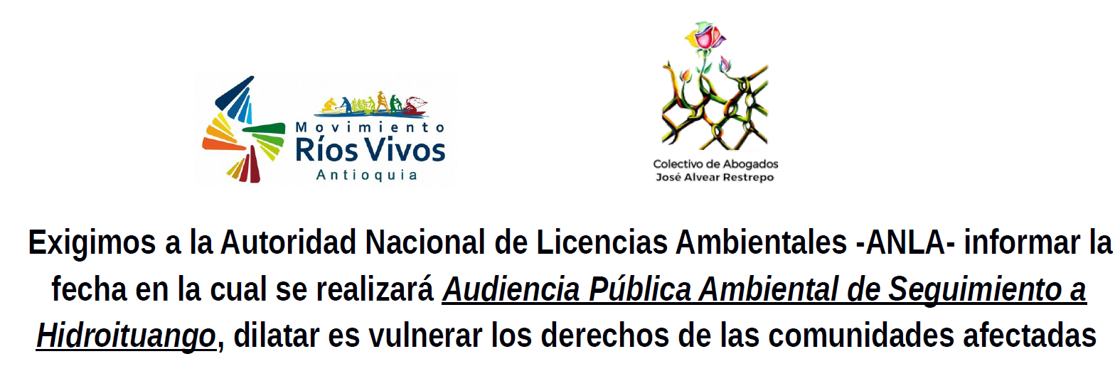 El Movimiento Ríos Vivos Antioquia -MRVA-, el Colectivo de Abogados ‘José Alvear Restrepo’ -CAJAR- entre otras organizaciones y cientos de firmas de personas, solicitamos con el lleno de los requisitos exigidos por la ley 99 de 1993 y del decreto 330 de 2007, la realización de una audiencia pública ambiental de seguimiento a la licencia ambiental del megaproyecto energético ‘Hidroituango’ (LAM2233), en vista de que se sustenta en -al menos ocho (8)- procesos sancionatorios en curso que dan cuenta de los incumplimientos de la licencia, se entiende que están dadas todas las condiciones procedimentales, jurídicas y administrativas ambientales para que esta audiencia proceda, máxime cuando para este tipo de megaproyectos se requieren espacios que garanticen la participación efectiva de las comunidades afectadas.