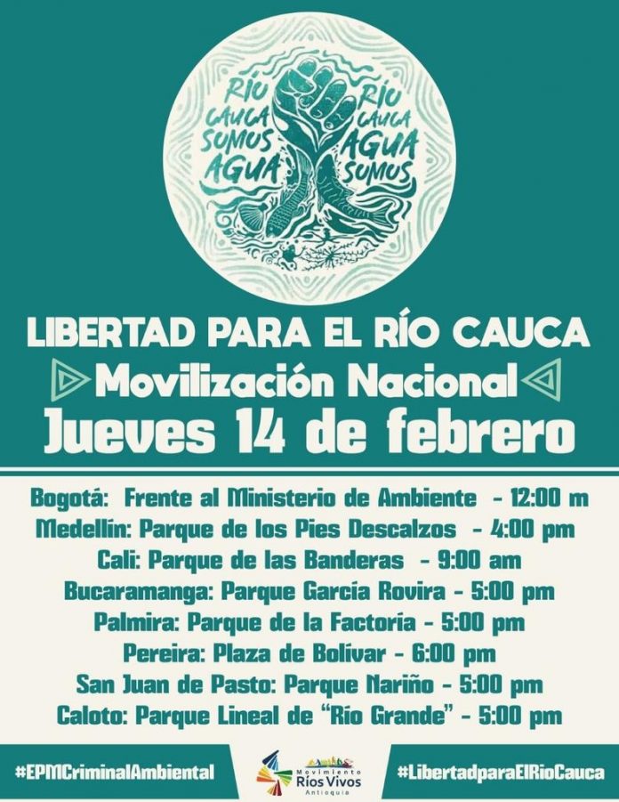Invitación para este jueves 14 de febrero, movilizaciones en todo el país por la protección del Río Cauca así como por las comunidades y especies que dependen de él.