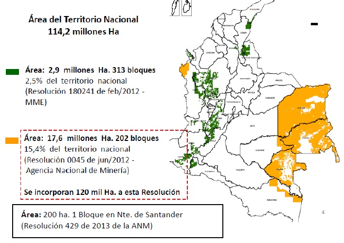 El 15 de mayo de 2015, la Sección Tercera del Consejo de Estado ordenó la suspensión de los efectos jurídicos de las Resoluciones 180241 de 2012 emitida por el Ministerio de Minas y Energía; Y las Resoluciones 0045 de 20 de junio de 2012 y 429 de 27 de junio de 2013 emitidas por la Agencia Nacional de Minería, por medio de las cuales estas entidades crearon y delimitaron 516 zonas específicas denominadas Áreas Estratégicas Mineras o Bloques Mineros.