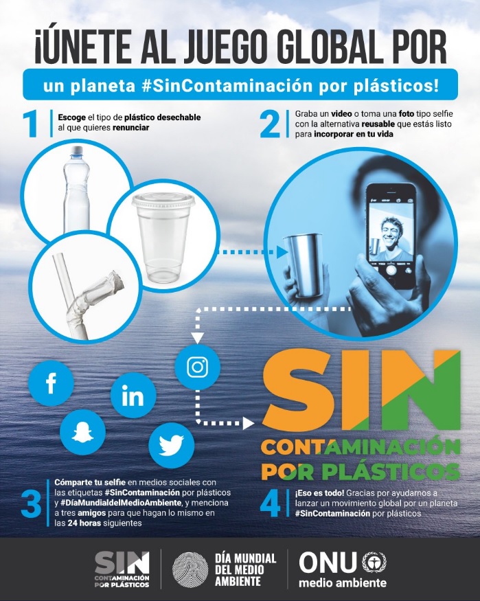- Cómparte tu selfie en medios sociales con los hashtags #SinContaminación por plásticos y #DíaMundialdelMedioAmbiente, y etiqueta a tres amigos para que hagan lo mismo en las 24 horas siguientes. No olvides mencionar a @ONUMedioAmb en Twitter y @ONUMedioAmbiente en Facebook.